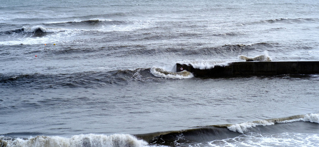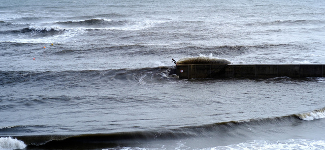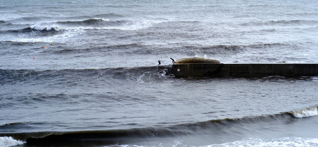 So, as my family walked on, I hung back a little and trained the camera as best I could on the wall below and was treated to the two life guards suddenly running and jumping into the big swell just before a large wave hit the wall.