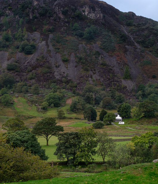 It can be difficult conveying the scale of landscape images without easy reference points at times, but this cottage and caravan set against the dark hillside behind provided both scale and a nice bit of contrast. It helps show the steepness of the land as well I think.