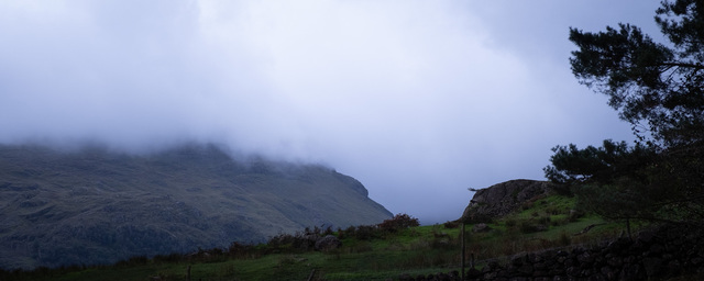 My last image from this spot was a wider shot, including some local sheep and I think giving more a sense of being down in a valley. I went for a 6x17 crop that helps throw away some of the less interesting content from the sky and near wall. Chopping the top off the tree on the left possibly isn't ideal but I think actually helps close the image in and give a sense of scale near in as well as the distance to the hills and mountains behind.