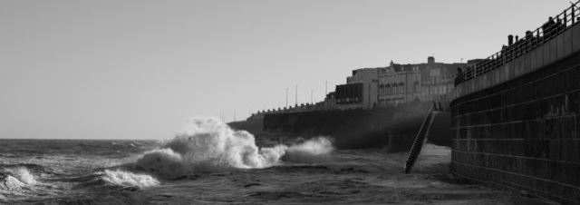 With only the GF 32-64mm lens on me, I couldn’t zoom in particularly close on the waves but, moving along as far as the tide allowed, I could get a reasonable view along the bottom of the promenade wall and up one of the ramps, where people were watching over the rails as the waves crashed up and on to them.