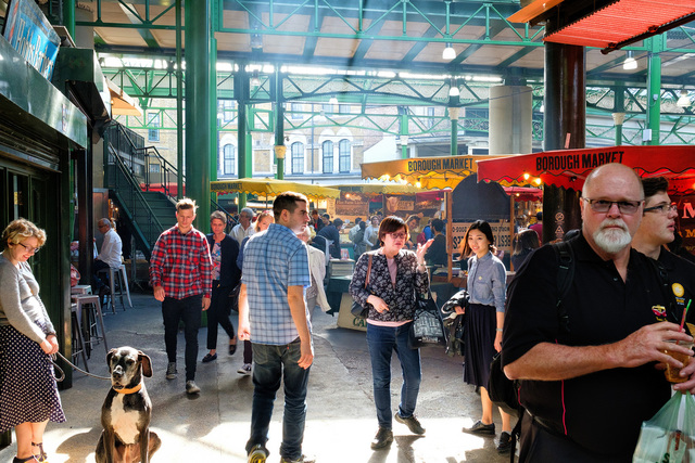 I think it was the lady towards the centre of the frame that caught my eye: I liked the way the light was falling on her and a small gap had opened in the crowd. I also love the lady with the dog in the bottom left. It's a shame the dog isn't in focus but that's the kind of thing that happens with snapshots like this.