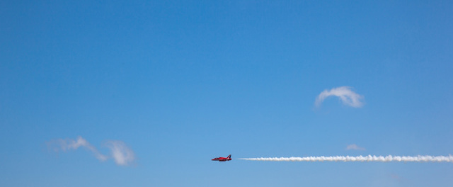 A quick one to break out of the mini run of black & white images recently: a single Red Arrows plane on a beautiful, clear blue sky.