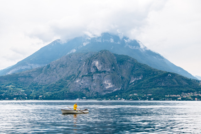 We found a nice pizza place for lunch (I had an amazing calzone) and then a bit more of a walk by the lake when I spotted this bright yellow fisherman picked out against the mountain behind. By the time I got myself sorted, he'd drifted off-centre from the mountain a little but it's still a nice composition.