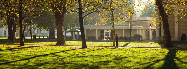 We had already walked through the gardens from the Cutty Sark where I’d caught a couple of other nice shots in the low, side-lit morning sunshine. There were blue skies, but in processing these images they’ve all ended up working best in the panoramic 65x24 ratio—of the Fuji T-X1/Hasselblad X-Pan—where the sky is cropped out and so doesn’t distract from the scene itself.
