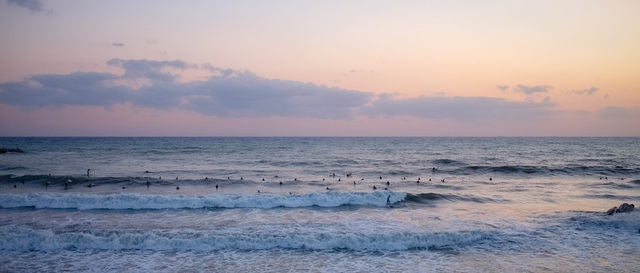 I also like the alignment of surfers, waves and horizon line which creates an almost orderly feel to the majority of the surfers waiting for the right wave.