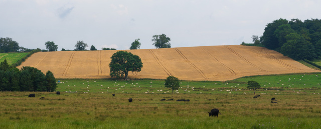 As you can see, I chose to crop into a pretty wide panoramic frame when doing a very quick post-process on the image. The snapshot above shows that there wasn’t a lot of foreground interest other than the sheep quite close in to the tree, while the sky was pretty bland too. I liked the framing of the green fields and small wood around the more sepia wheat field that silhouettes the subject tree.