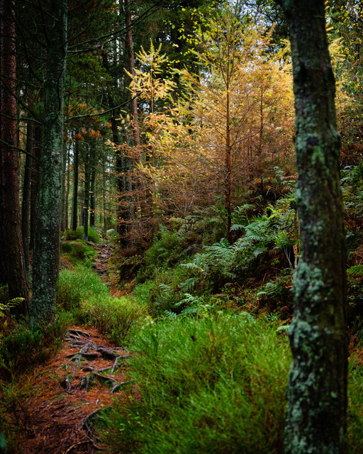 The day had started with an attempt at finding Harwood Forest, falling into the trap of following Google Maps to the wrong side entirely for easy access and wasting much of my precious photo day being unproductive. I then got distracted from my woodland focus and climbed up Simonside—which was enjoyable but also a bit of a waste photographically—before eventually stumbling across this woodland (although, to be fair, I spotted the block of vivid autumn colour on the trees from my high vantage up atop the Simonside hills).