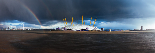 Once I'd got this far though, it was clear that I really didn't need a lot of the stuff on the right-hand side: the slightly blown-out sky, large buildings and small glimpse of railing and pathway are just a distraction from the real interest—the weather crossing the O2 Arena and double rainbow.