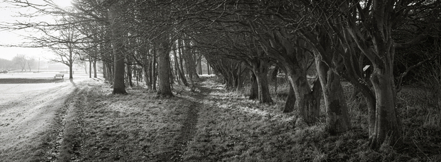 In one section of the park, there's a triangular stand of gnarled trees that have been left between the waggonway and the fields, with a couple of small paths worn through them.