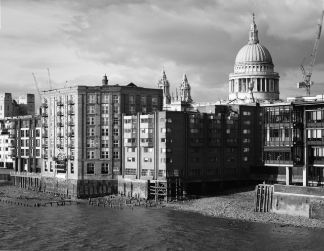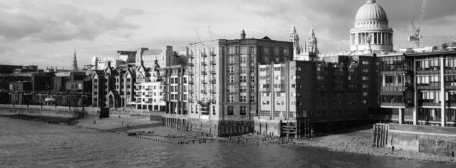 This photograph is a hand-held pano stitch but I'd also done another, much wider, pano pulling in more of the riverside to the left of frame which I really liked. The light on the day was fantastic for black and white, with lots of contrast and the combination of buildings on this stretch of river worked really nicely. There were two problems with the wider shot though: a couple of the frames were blurry (perils of shooting panos hand-held), ruining some details and I missed a portion of the sky in the top left that's needed to included the full height of St Paul's Cathedral (less of an issue thanks to content-aware fill).