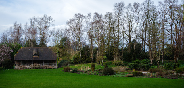 This photograph of the pavilion and some of the surrounding trees was taken as we waited for the little land train to arrive and ferry us back to the car park. There'd been a downpour and everyone was huddled under a shelter so I went for a little wander and took this as a 4-frame panorama, hand-held. I liked the copse of trees to the right, and the old pavilion itself nestled on the far left. The lawn in the foreground gives enough breathing room and the curve of the planted border acts as a nice leading line to still point in at the pavilion as the central subject.